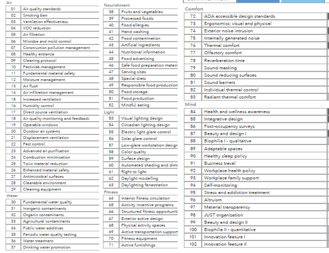 总体来说,WELL评价体系主要包含7大体系和102个指标,改善人体11大身体系统。WELL建筑标准分成七大福祉类别“概念”,分别为:空气、水、营养、光线、健身、舒适性和精神。每个概念包括多个特性,旨在解决住户健康、舒适性或知识的特定方面问题。每个特性分为若干部分,这些部分通常根据特定建筑类型而定制。每个部分有一个或多个要求,用于指明必须满足的特定参数。