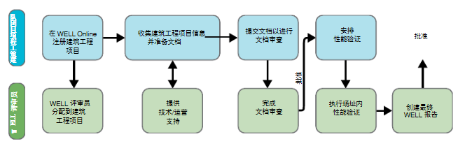 WELL认证程序包含两个部分:第一部分,类似LEED认证的文件审核阶段;第二部分,由一名“WELL评审员”(WELL Assessor)执行“现场性能验证”。